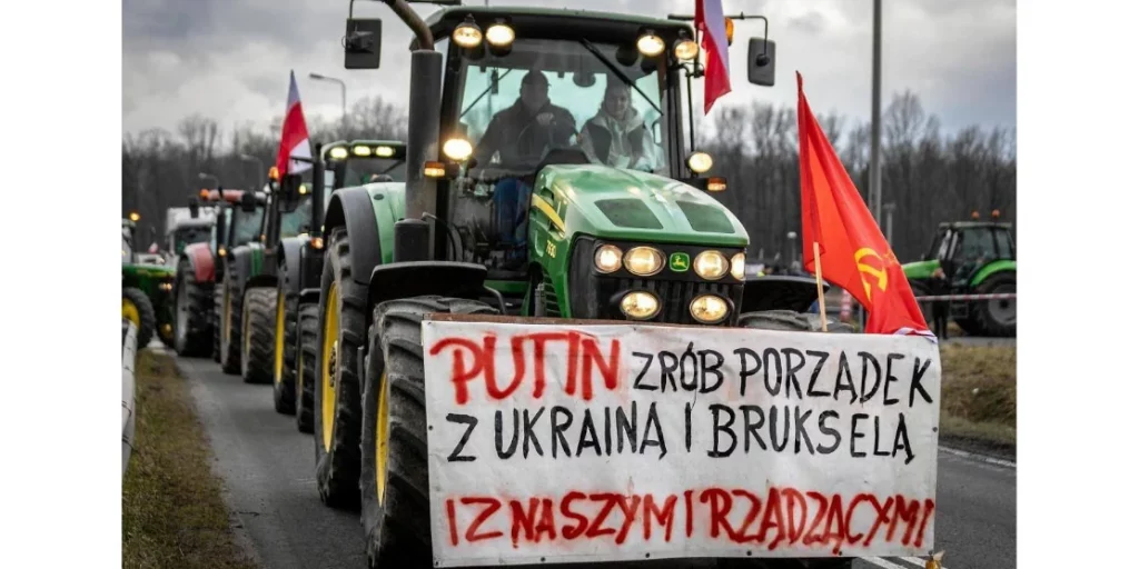 Як повідомлялося раніше, під час блокування польськими фермерами українських вантажів на кордоні, один із фермерів приїхав на тракторі з плакатом, на якому було написано: “путін розберись і з Україною, і з Брюсселем, і з нашим урядом”.