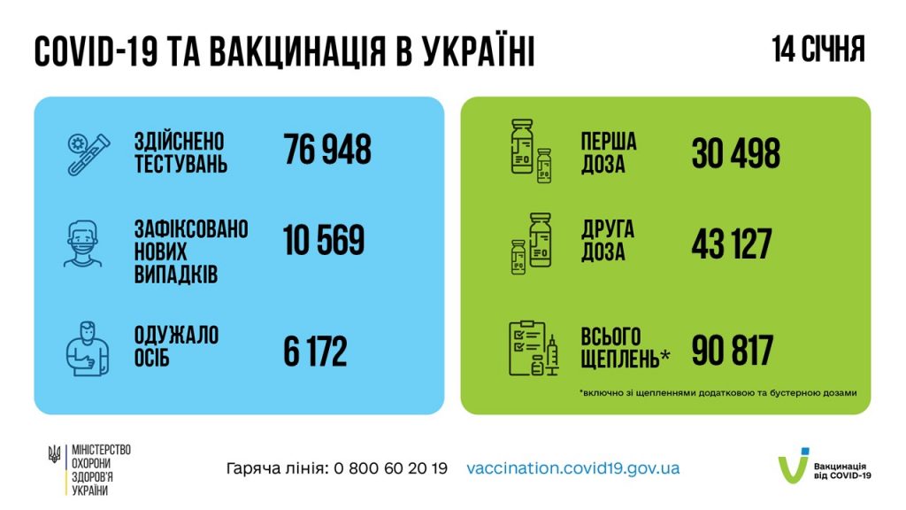 За добу 14 січня в Україні зафіксовано 10 569 нових підтверджених випадків коронавірусної хвороби COVID-19 (з них дітей – 727, медпрацівників – 229). Про це повідомили з МОЗу.