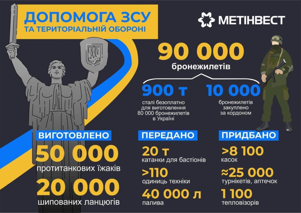 Також коштами Метінвесту придбані тепловізори, каски, аптечки, медичні турнікети та джгути, а ще раніше для оборони міст разом з партнерами ми поставляли протитанкові їжаки та ланцюги проти колісної техніки.