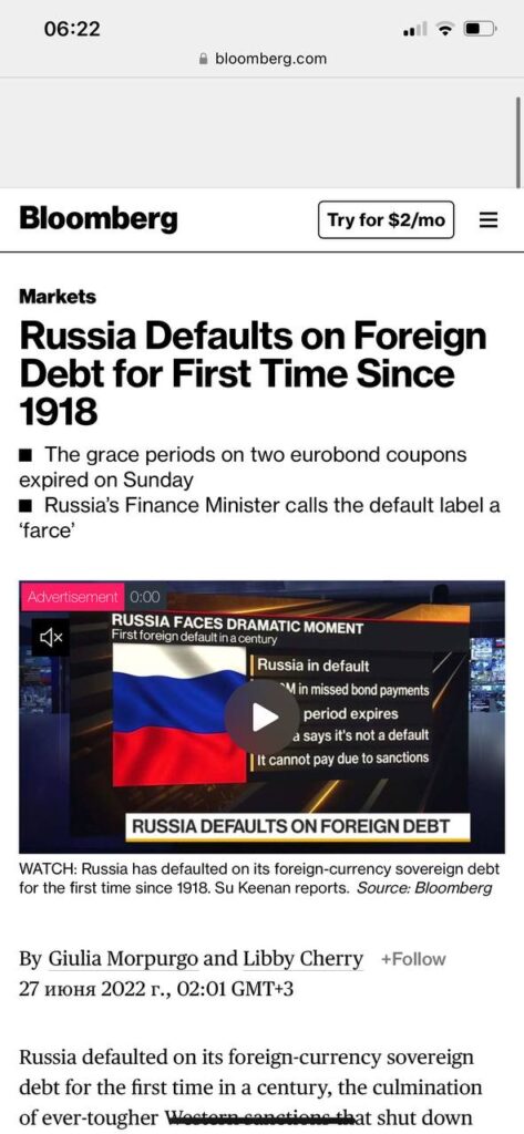 Вперше за століття у росії дефолт по її суверенному боргу в іноземній валюті. Це стало кульмінацією західних санкцій, які перекрили шляхи платежів закордонним кредиторам.