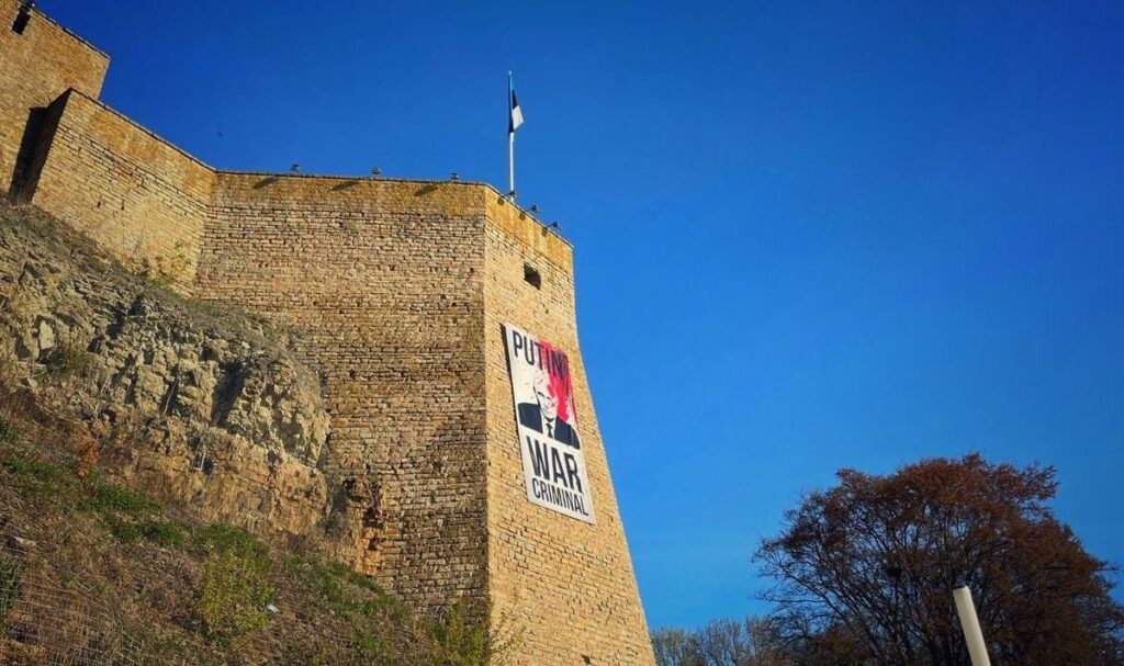 Зранку 9 травня на середньовічній фортеці в прикордонній Нарві місцевий музей вивісив баннер «Путін — воєнний злочинець». Цей плакат добре видно мешканцям сусіднього російського Івангорода — обидва міста розділяє річка.