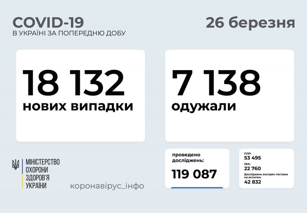 18 132 нових випадки коронавірусної хвороби COVID-19 зафіксовано в Україні станом на 26 березня 2021 року.