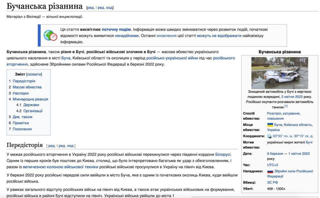 Сьогодні у загальнодоступній вільній багатомовній онлайн-енциклопедії “Вікіпедія” опубліковано статтю Бучанська різанина, також різня в Бучі, російські військові злочини в Бучі — масове вбивство українського цивільного населення в місті Буча, Київської області та околицях у період російсько-української війни під час російського вторгнення, здійснене Збройними силами Російської Федерації в березні 2022 року.