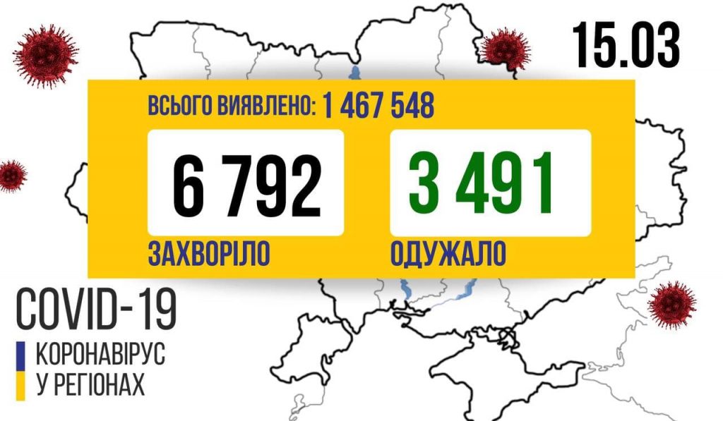 6 792 нових випадки коронавірусної хвороби COVID-19 зафіксовано в Україні станом на 15 березня 2021 року. Зокрема, захворіли 326 дітей та 109 медпрацівників.