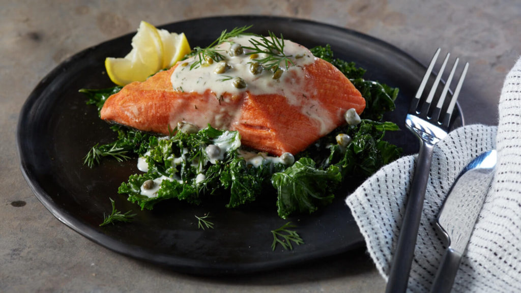 Філе минтая, приготовлене на парi та приправлене травами, може подаватися з одним із трьох соусів на вибір. Соуси до риби – чудовий спосіб урізноманітнити меню, не докладаючи багато зусиль. Кожен із соусів розкриває делікатний смак минтая по-своєму. Приготування на парі зберігає поживні речовини і аромати, а лимонний соус зі сметаною, соус із в’яленими томатами та горіхами або зелений чимічурі надають традиційній страві нове прочитання.