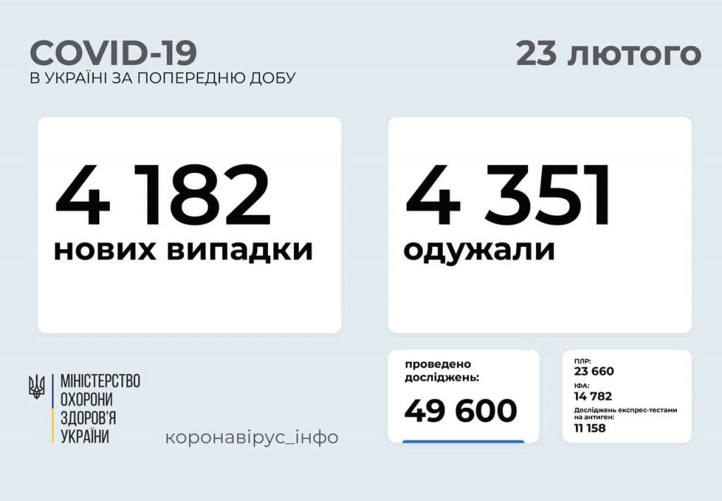 4 182 нових випадки коронавірусної хвороби COVID-19 зафіксовано в Україні станом на 23 лютого 2021 року. Зокрема, захворіли 252 дитини та 219 медпрацівників.
