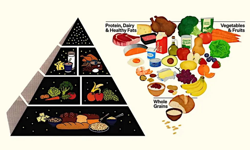 Головний акцент – на цільних, поживних продуктах, зменшенні ультрапереробленої їжі та якості, а не лише калоріях. Нова візуалізація – перевернута харчова піраміда: широка верхня частина з білками, молочними продуктами, здоровими жирами, овочами та фруктами; вузька основа – з цільнозерновими.