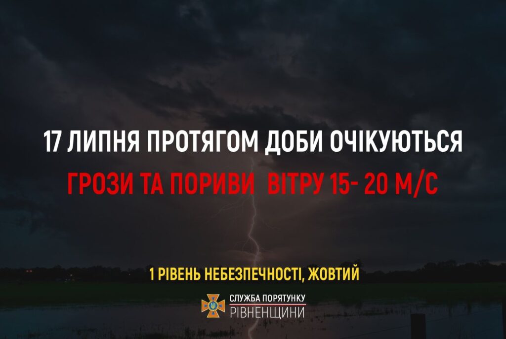 За даними Рівненського обласного гідрометцентру, 17 липня очікуються грози та шквалисте посилення вітру 15-20 м/с. (І рівень небезпеки, жовтий).