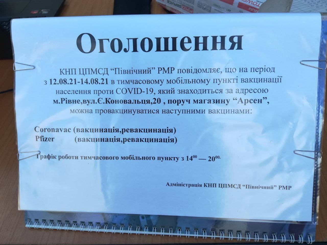 Неподалік супермаркету Арсен, що у Рівному на вулиці Євгена Коновальця, 20 рівняни можуть зробити щеплення проти COVID-19.