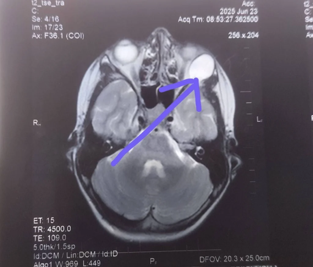 До Рівненської обласної дитячої лікарні звернувся 14-річний пацієнт із випинанням лівого ока, косоокістю та двоїнням предметів. Під час обстеження та МРТ було виявлено новоутвір очної ямки великих розмірів (приблизно 20 мм), який змістив очне яблуко та спричинив наявні симптоми.