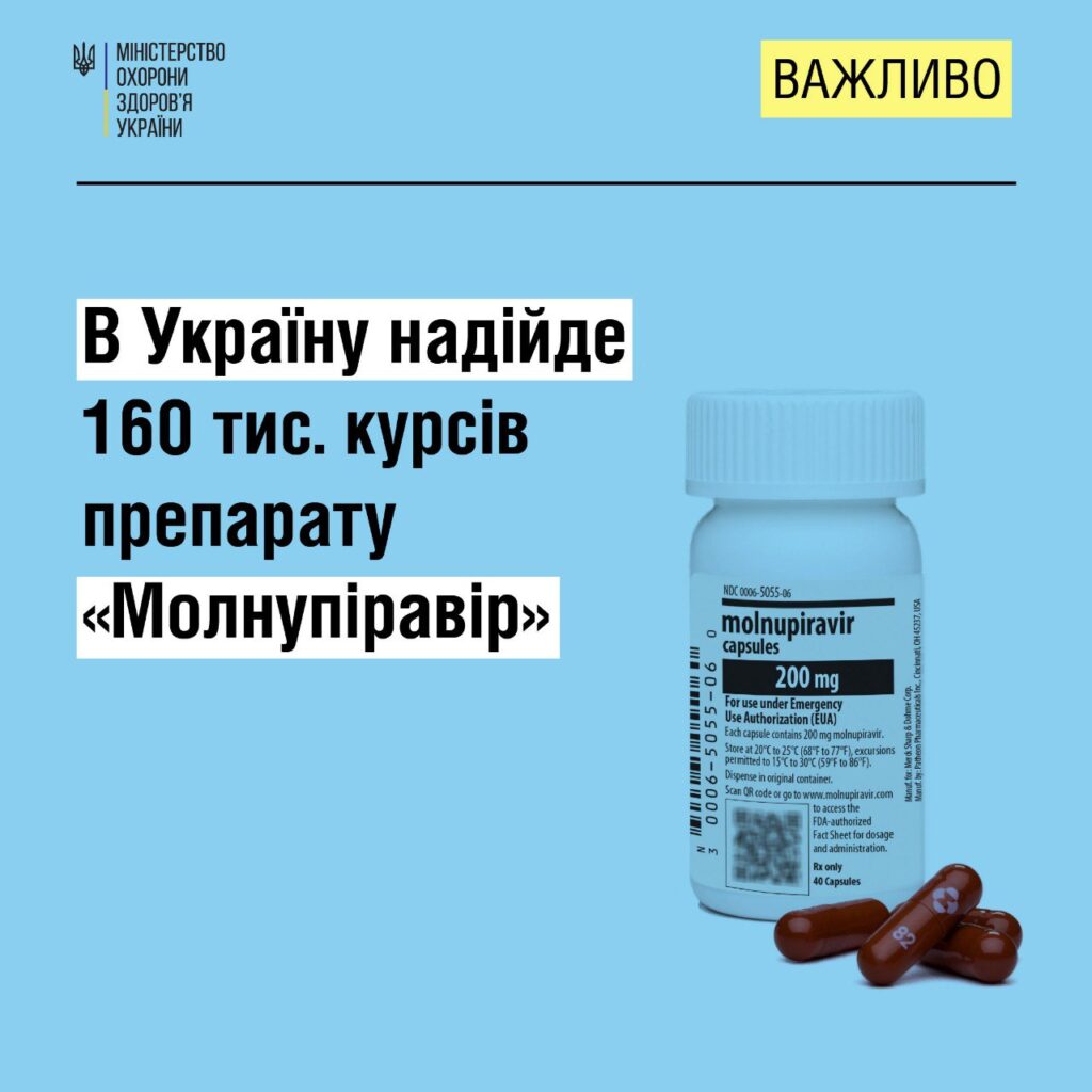 50 тис. курсів «Молнупіравіру», закуплені за кошти держбюджету, передані міжнародною організацією «Crown Agents» для постачання в Україну. Решта – 110 тис. курсів – надійде до кінця травня.