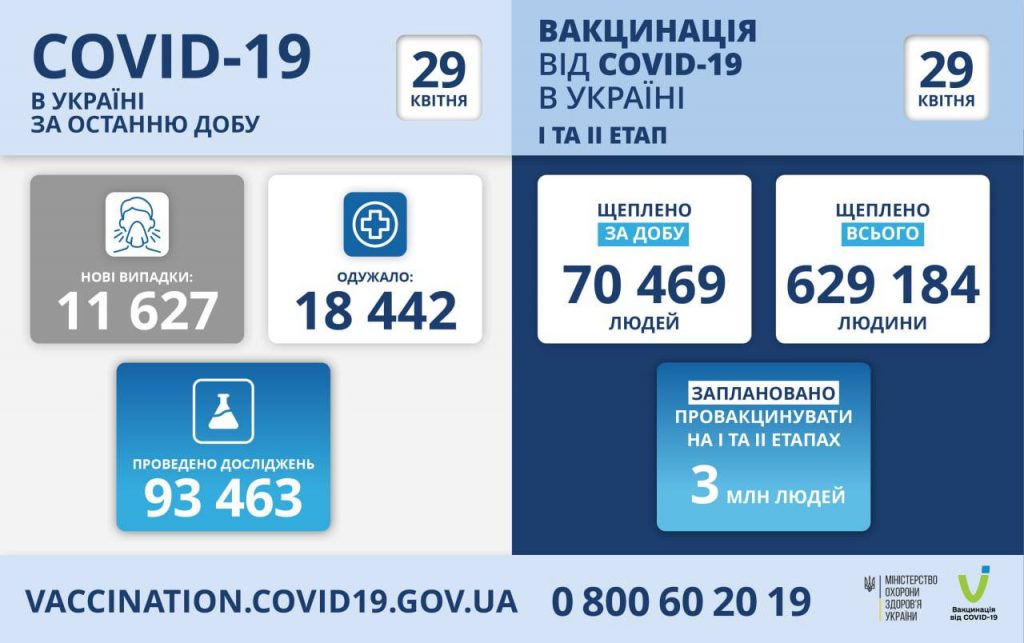 11 627 нових випадків коронавірусної хвороби COVID-19 зафіксовано в Україні станом на 29 квітня 2021 року. Зокрема, захворіли 518 дітей та 259 медпрацівників.